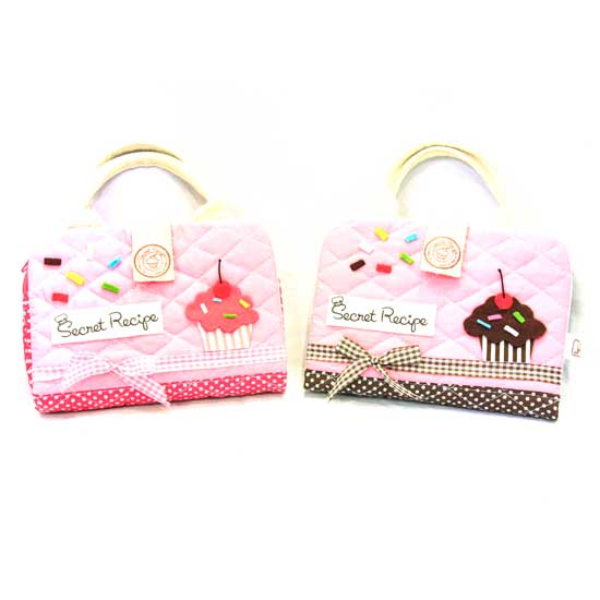 The cute diary bags are completed with rhombic-shaped stitches. Their pink surfaces are attached with lovely cake patches and multicolor trimmings. The latter are further enriched with polka dots and checked ribbons.