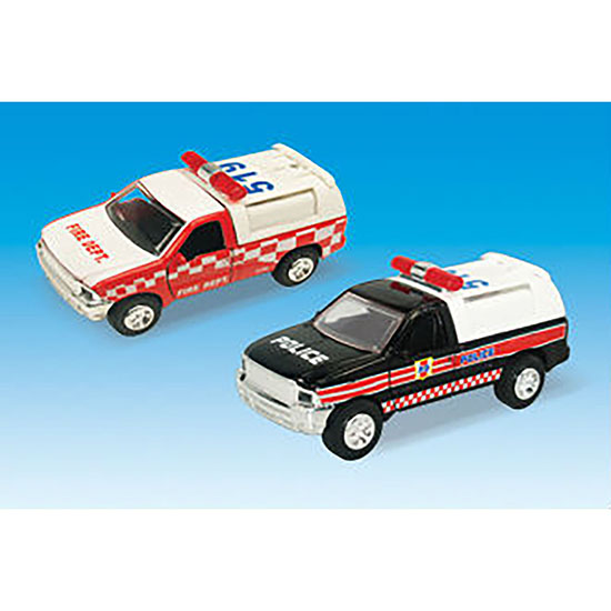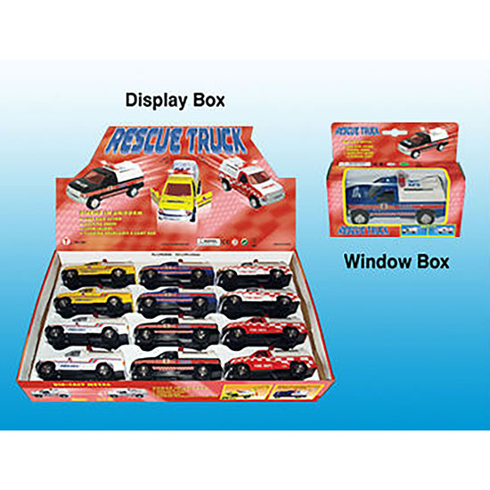 Finely crafted in a realistic design, this die cast rescue truck has opening doors and can generate siren sounds. It has pull back action for smooth moving and is equipped with flashlight headlights and lightbar. This die cast rescue truck flaunts a durable construction and is available in police and fire department designs.
