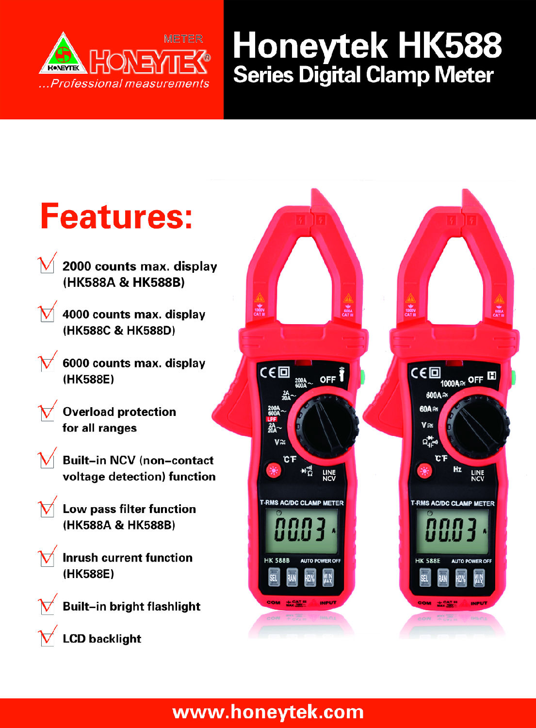 2000 counts max. display (HK588A & HK588B) 4000 counts max. display (HK588C & HK588D) 6000 counts max. display (HK588E) Overload protection for all ranges Built-in NCV (non-contact voltage detection) function Low pass filter function (HK588A & HK588B) Inrush current function (HK588E) Built-in bright flashlight LCD backlight