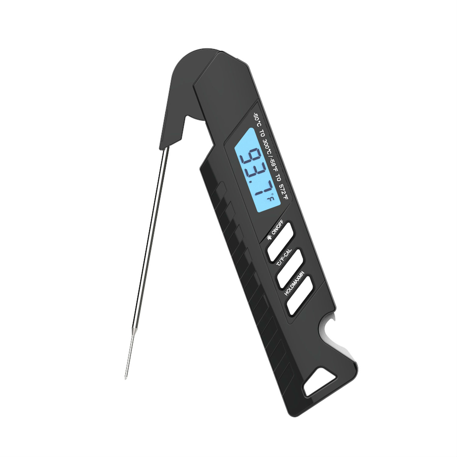 Response Time: 2-4 seconds Accuracy: ±0.9°F -4~302°F (±0.5°C -20~150°C) Range: -58°F-572°F (-50~300°C) Battery included Strong Magnet on backside °F/°C selectable Water Resistance: IP67 Bottle Opener Passed CE,FCC, ROHS, MSDS,FDA certificates