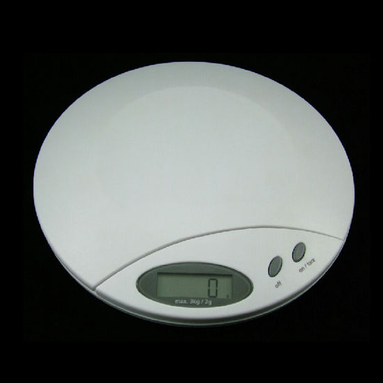 This is a digital kitchen scale in a round shape. It features a strong housing with a glossy finish. This scale is engineered to offer reliable measuring results.