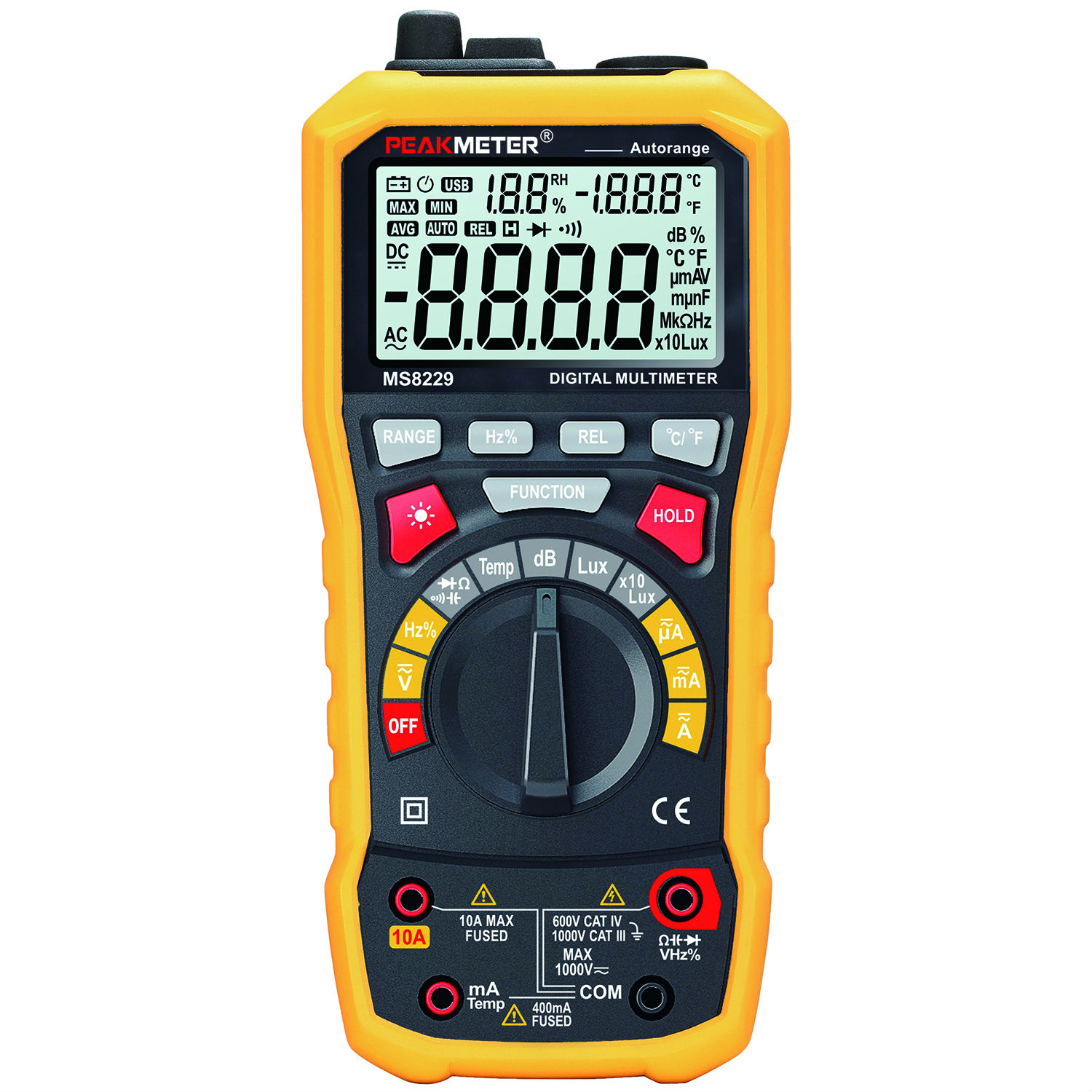 4000 counts DMM with multisenor input for temperature, humidity, lux, sound level measurements Data hold and LCD backlit Relative measurement Auto/manual ranging, auto power off Integrated protection holster, safety as per IEC1010-1 Cat.III 600V & Cat.II 1000V Technical Specifications: DCV: 400m/4/40/400/1000V, ±0.7% ACV: 400m/4/40/400/750V, ±0.8% DCA: 400u/4m/40m/400m/4/10A,±1.2% ACA: 400u/4m/40m/400m/4/10A,±1.5% OHM: 400/4k/40k/400k/4M/40MΩ, ±1.2% CAP: 40n/400n/4u/40u/100uF, ±3.0% FREQ: 10/100/1k/10k/100kHz, ±2.0% Duty cycle: 1~99%, ±3.0% TEMP: -20℃~1000℃ (-4℉-1832℉) , ±2.0% Temp (NTC): 0℃~4℃ (32℉~104℉), ±20C/4℉ %RH: 30%~95%, ±5.0%RH LUX: 4,000/40,000Lux, ±5.0% Sound dB: 35~100dB, ±3.5% Audible continuity & diode test Dimensions: 204x93x57mm, 580g Battery: 1.5Vx4, AA size