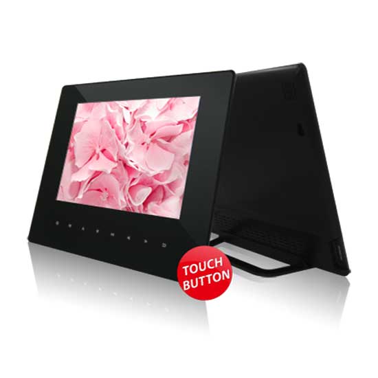 Showcased is a digital photo frame featuring Wi-Fi Internet connection. The 16:9 wide screen displays your photos with brilliant image qualities. The subtle appearance draws all attention to your precious photos.