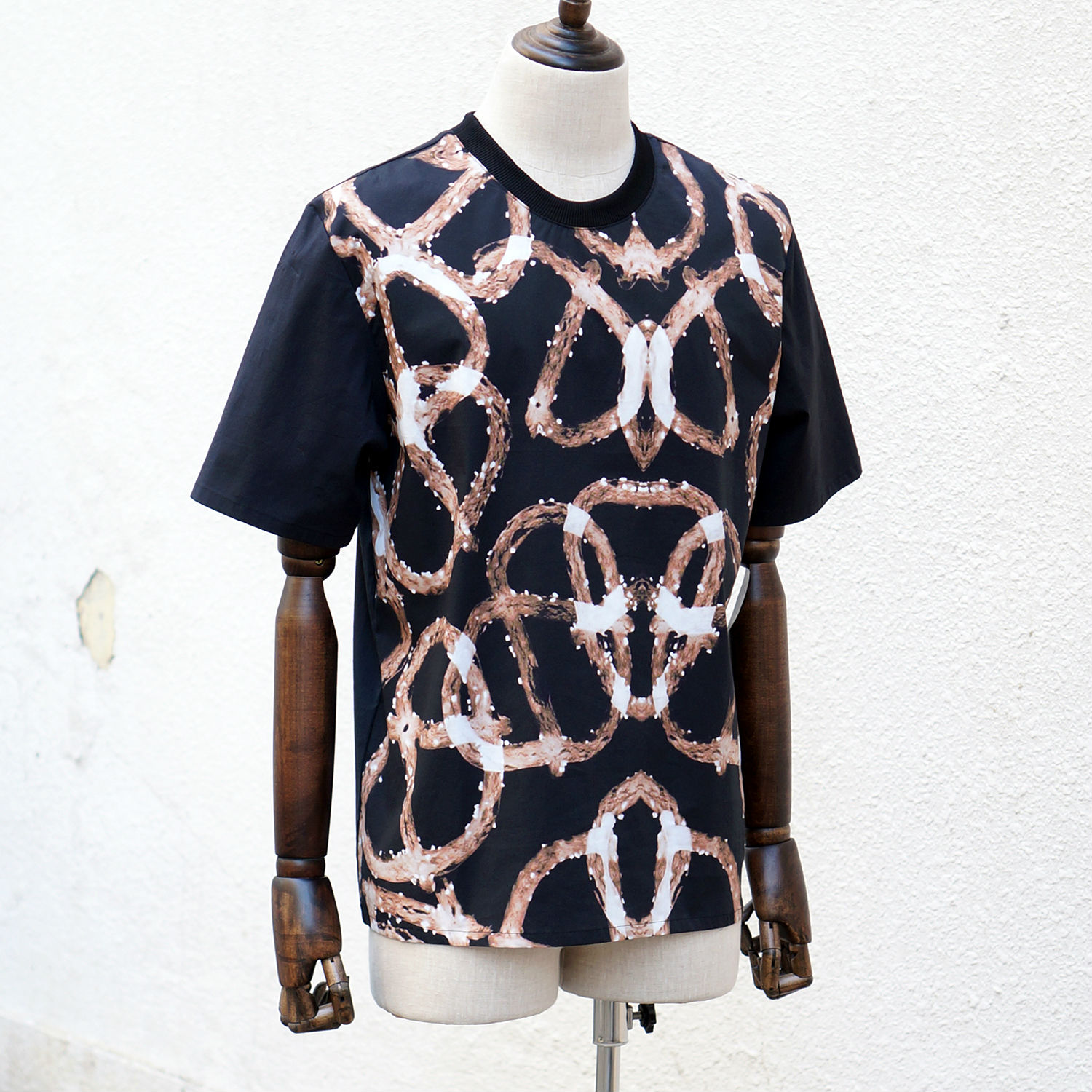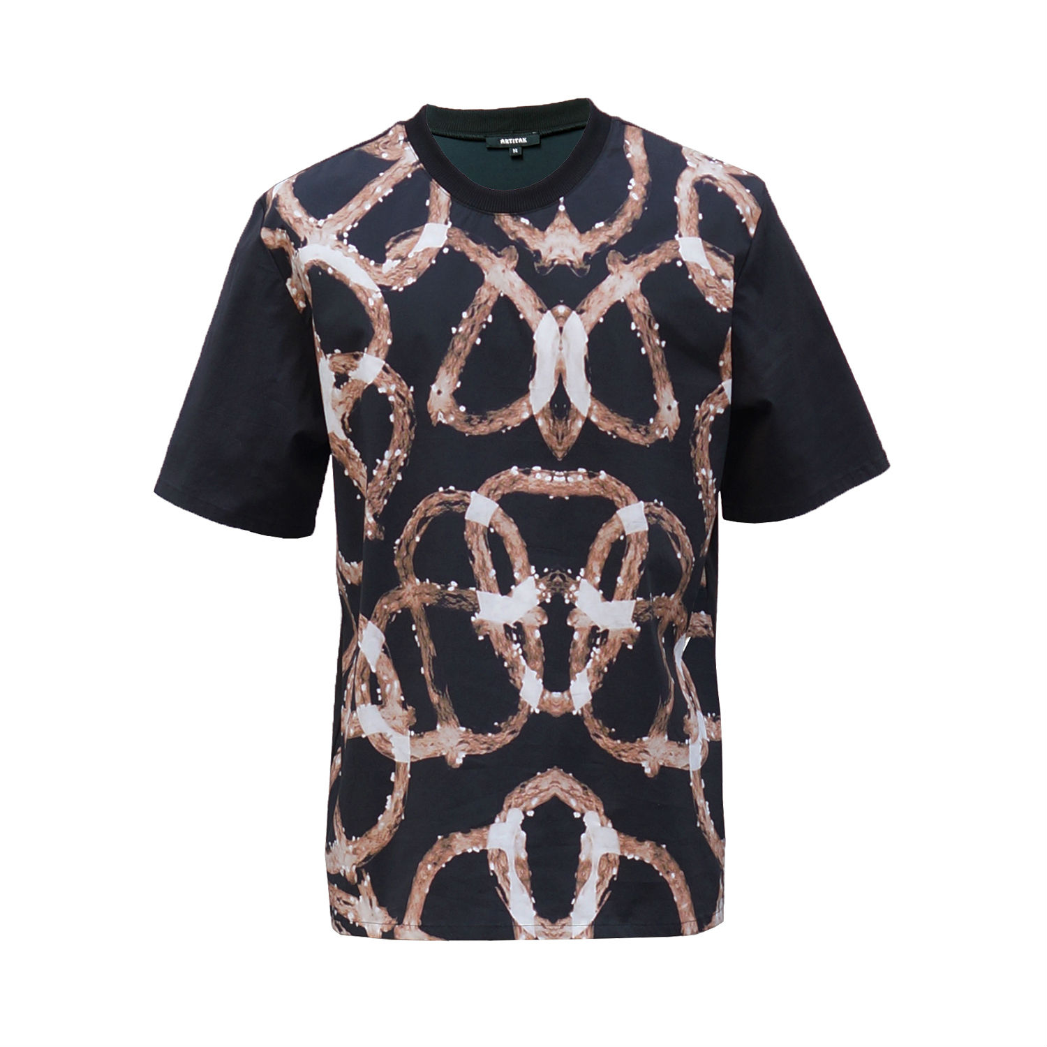 Try out this bold t-shirt if you are so fed up with boring solid-colored tee in your wardrobe. This is a dark, short-sleeve one, and a tangled seamless pattern is printed all over the front bodice for added appeal. The outfit sheds smelly stuff more easily than synthetics as it is made with 97% fine cotton.