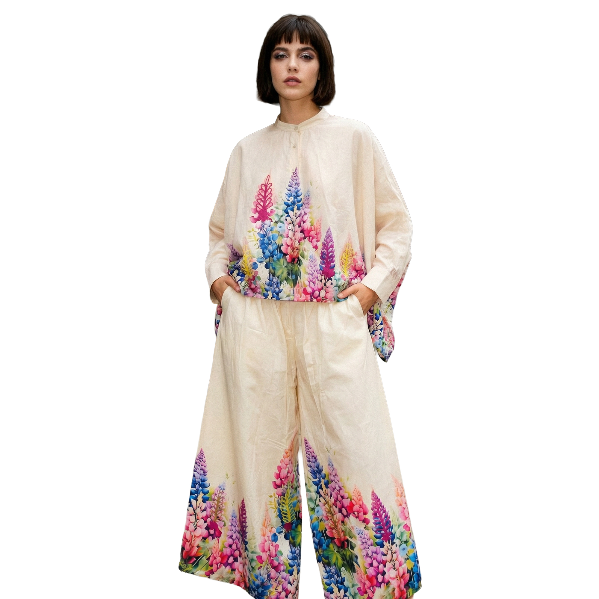 Step into bloom with our Lupine Garden Border Print — a stunning cream base fabric adorned with a vibrant watercolour-style floral border featuring lupine blooms in shades of pink, blue, purple, lavender, and yellow-green.