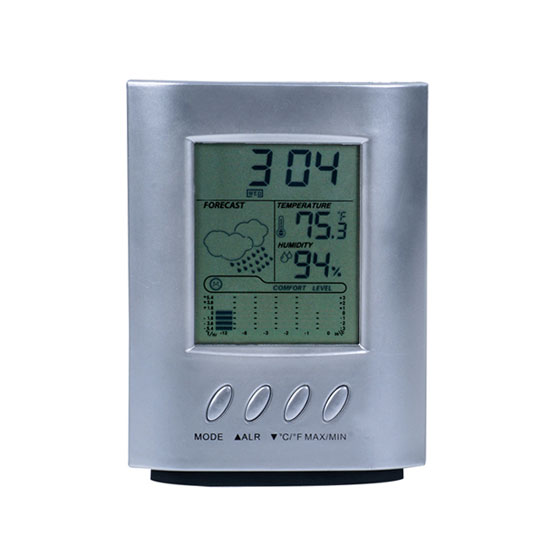 This digital thermo-hygrometer can accurately measure the relative humidity and ambient temperature in the room. The additional calendar display and weather forecast functions greatly enhance its practicality. This sturdy device in gray is ideal for household use.
