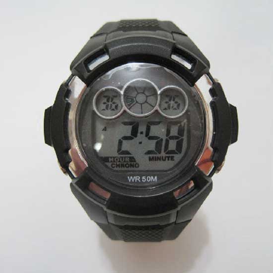This digital watch features a stylish design in black with a color electroplating bezel. It comes with multiple functions and a water resistant design that is great for outdoor activities.