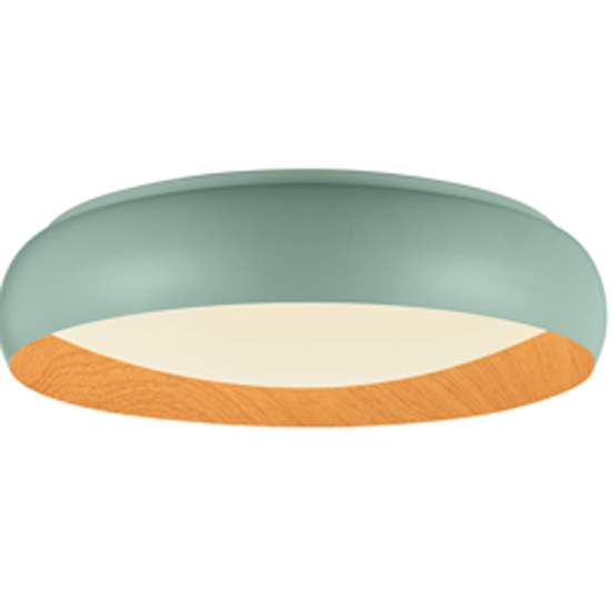 This is a round ceiling light. The upper lampshade is light green, and the bottom features a warm - brown frame with wood grain texture. With a round shape, it emits soft and comfortable light when lit.