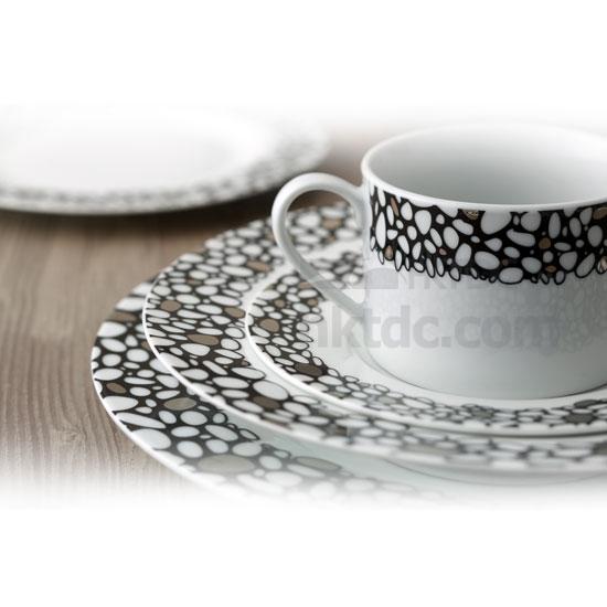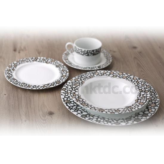 This is a dinner set featuring stone patterns. Made of porcelain, this dinner set feels solid and is durable. This high quality dinner set is a great choice for homes.