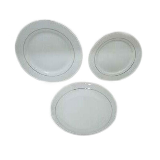 This is a dinnerware set that comes with 18 pieces. Each piece comes in an oval shape with a smooth finish. The silvery lines add a touch of elegance to this set.