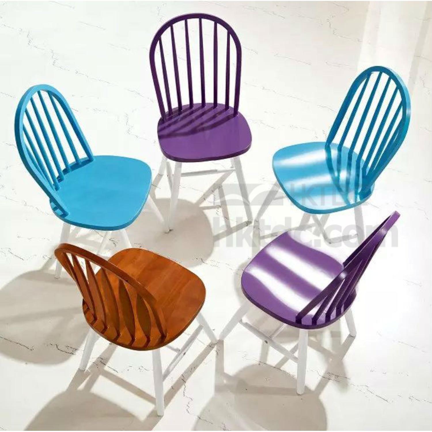 colorful wooden chairs, Sky blue, Deep Purple, Brown..