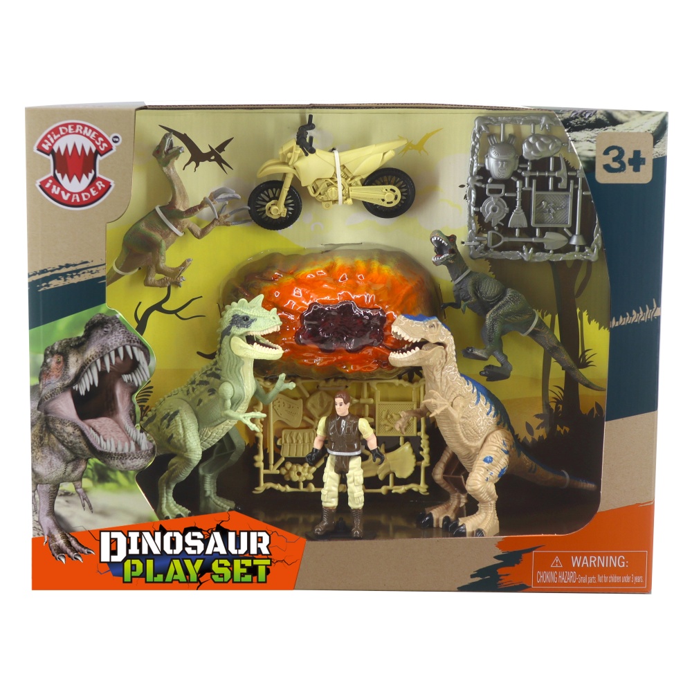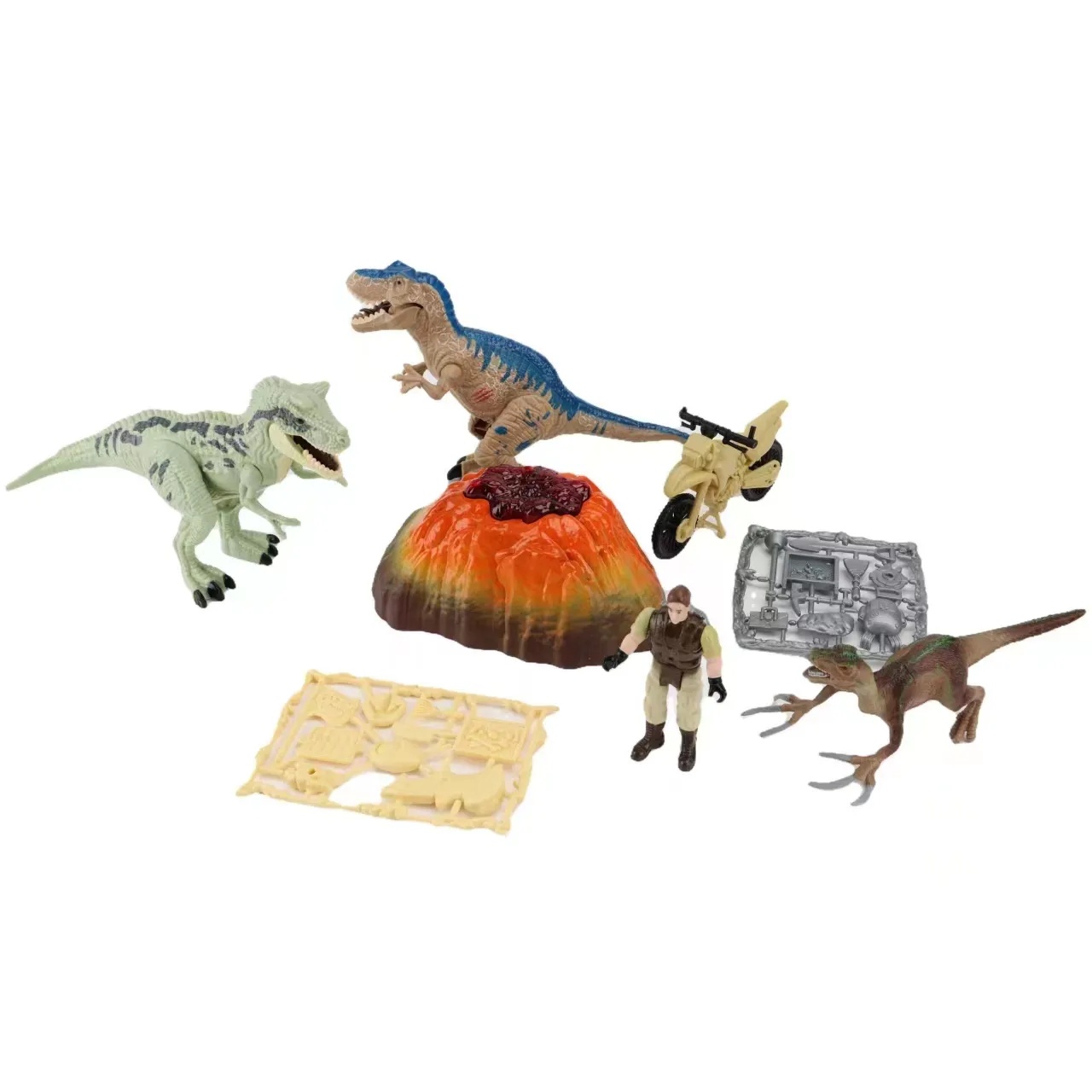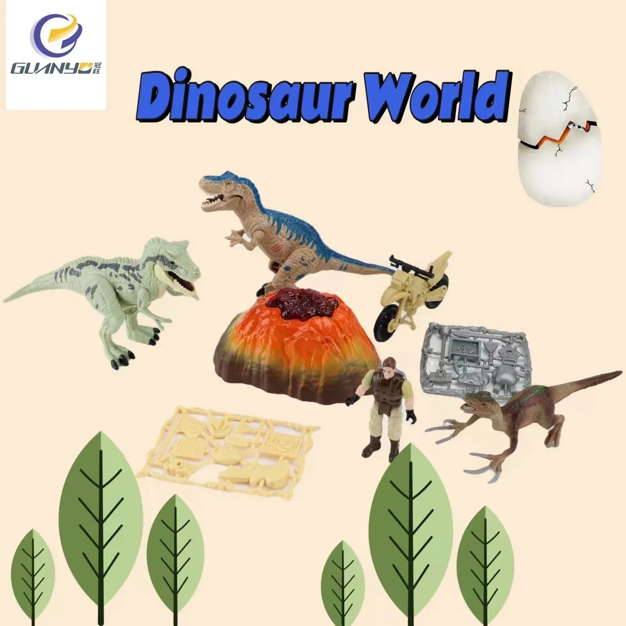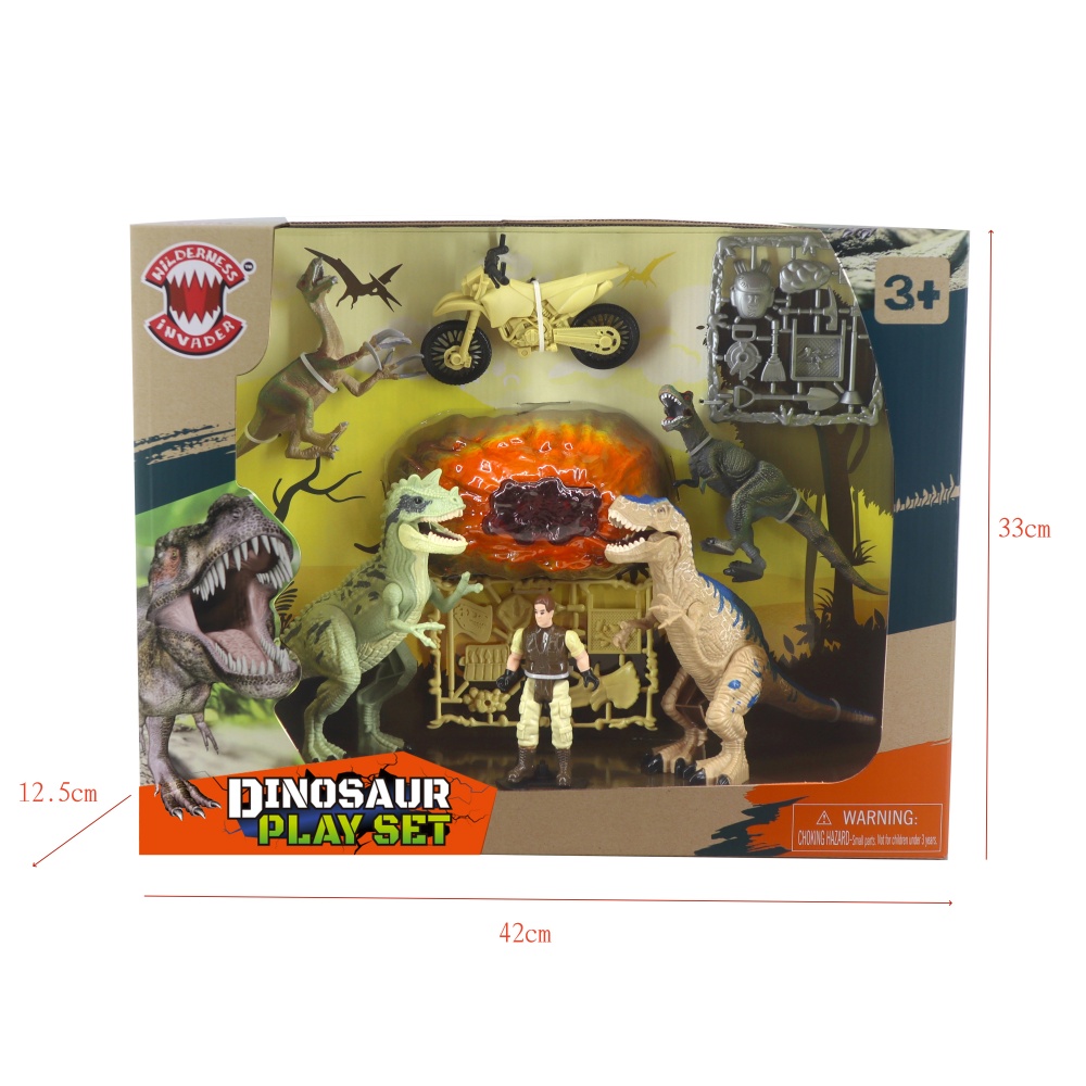 Volcanic belt sound and light, realistic restoration scene, including 3*AG13 button cells, easy to play. Two large dinosaurs can open and close their mouths by pressing their hands for added fun. Through simulation scenes, cultivate children's desire to explore and thirst for knowledge.