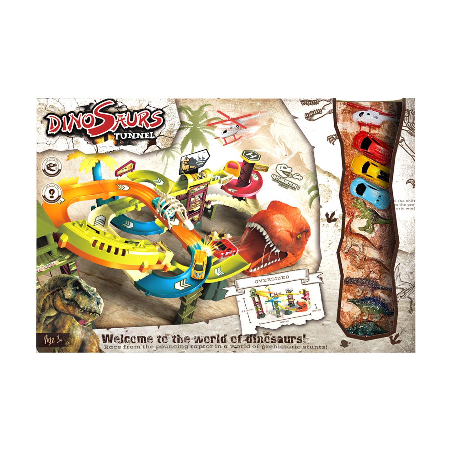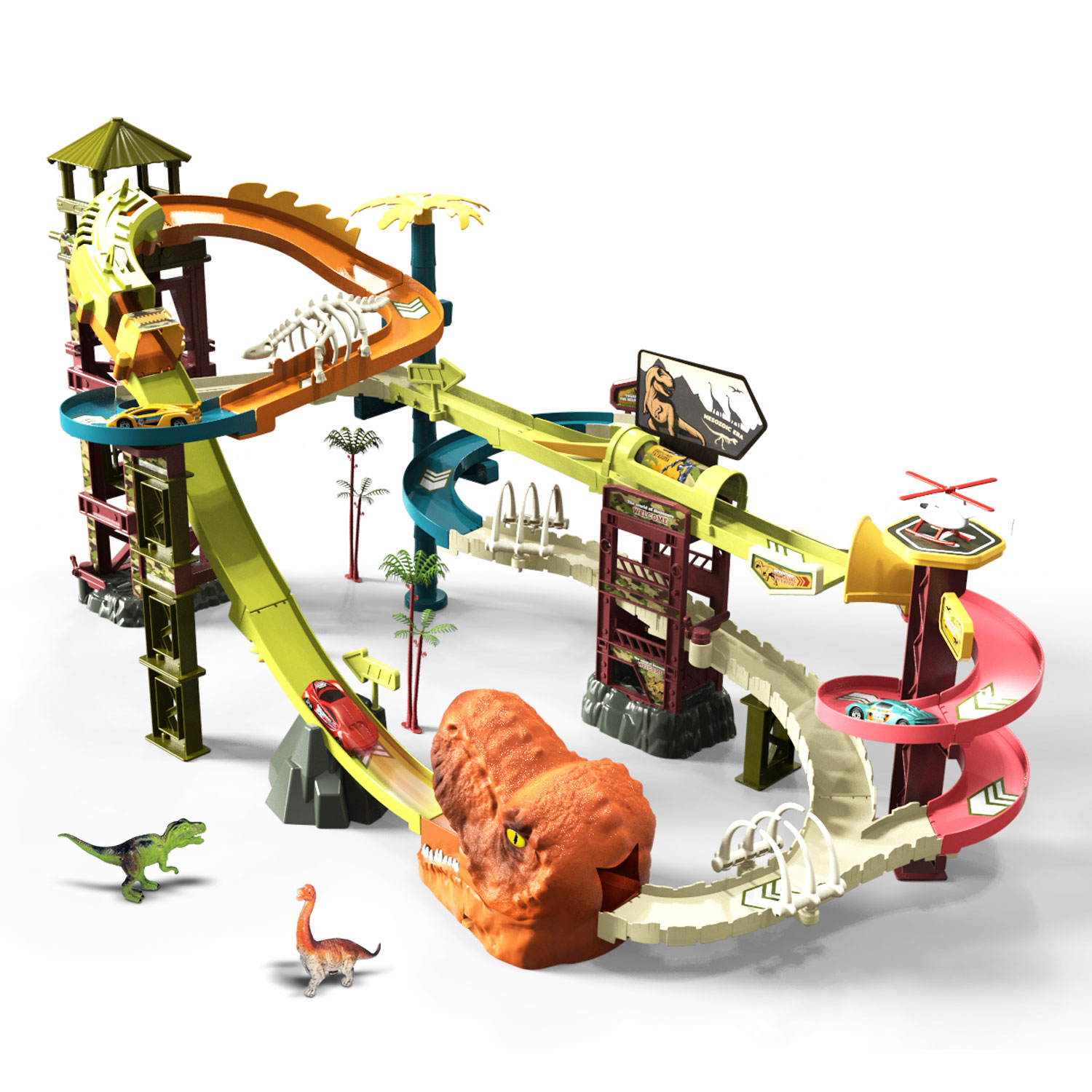 [Dinosaur Theme track] The theme of children's favorite dinosaurs. The toy comes with three sports cars, an airplane and six life-like dinosaur models. The track includes the dinosaur Head electric high-speed launch area, the pole challenge, through the dinosaur skeleton gate, the tunnel area, the curve area, the airport, the guard tower. To create the atmosphere of a prehistoric dinosaur jungle. Let's explore the world of dinosaurs.