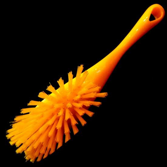 As shown here is a dish brush with an allover orange design, showcasing a vibrant touch. The PP-made dish brush boasts long-lasting use. This dish brush is great for home use.