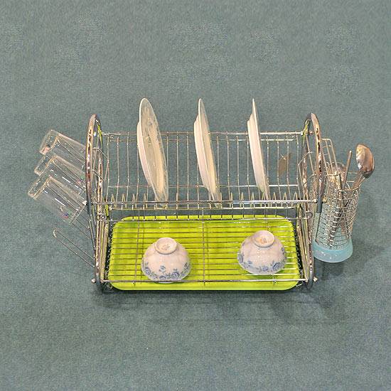 As shown is a dish and plate rack. It is made of metal wire. It is perfect for storing various kitchen utensils and cutlery.