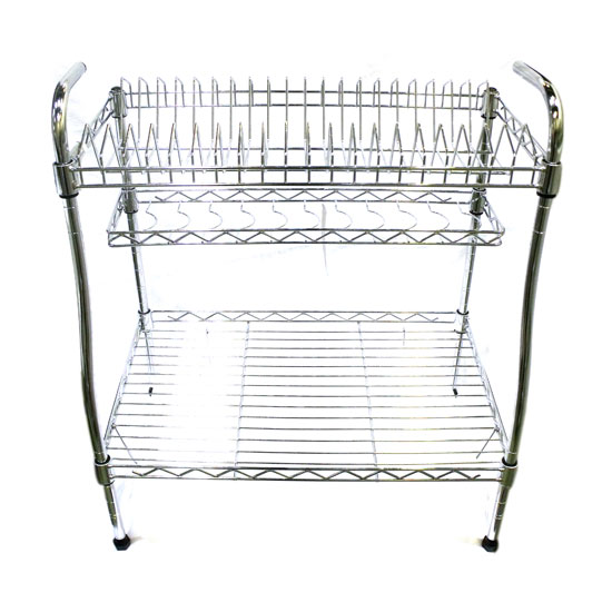 This metal dish rack features a two-tier design to maximize your storage space. The wire construction allows quick drying of dishes and bowls. An extra dish for collecting dripping water is included for users' convenience.