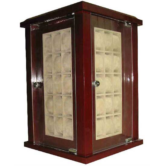 Here comes a display cabinet designed to present wristwatches. The cabinet comes with 4 faces for an all-round display. Each side features 15 holders to show timepieces vertically. Each clear glass door is set with a lock for guaranteed security. Display your antiques and collectible ornaments and watches with this high-end watch display cabinet.