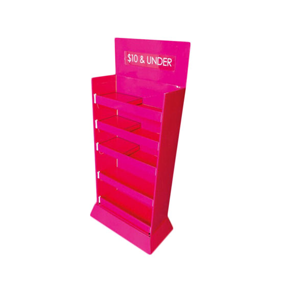 This is a cardboard display stand with five layers. It is designed in bright red for an eye-catching look. The robust housing can withstand daily wear and tear.