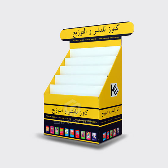 This is a stylish cardboard display stand with multiple layers. It is designed with colorful prints for an eye-catching look. This display stand offers an extra-long service life.