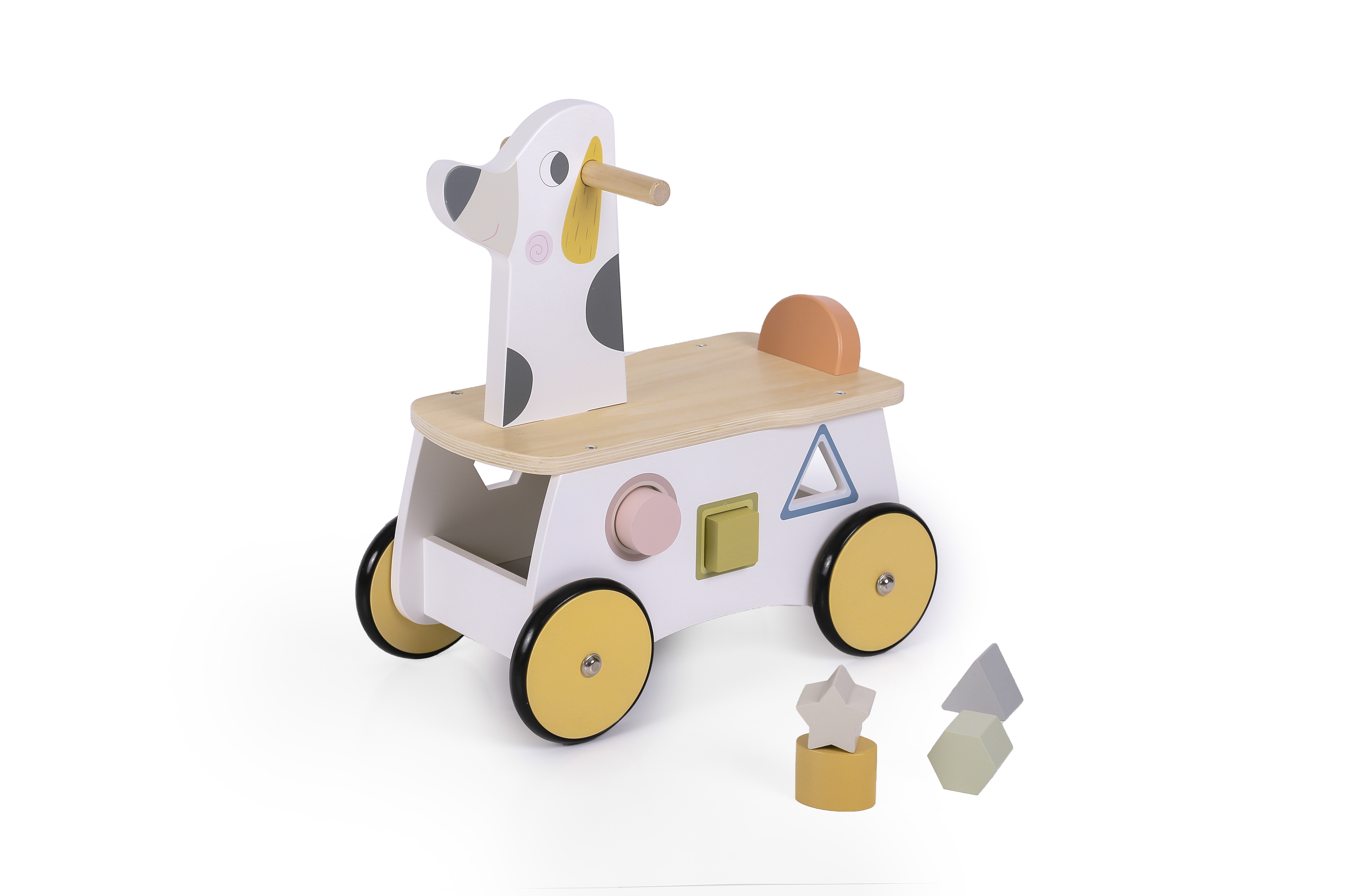 Ride on is designed for toddlers, cute animal image, exquisite function design is very good to train children's physical coordination, rubber band around the wheel can not only mute, but also play a non-slip role, mother can rest assured. Axle hole design slightly larger than the axle, baby riding not stuck, wheel rotation flexible, very smooth. Baby Can use the handle to turn the front left or right , adjust the direction.