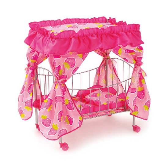 This doll bed features a girlish design in pink with strawberry patterns and ruffle trim. Casters are installed on the legs of the bed for easy moving. This delicate, adorable doll bed is fit for a princess.