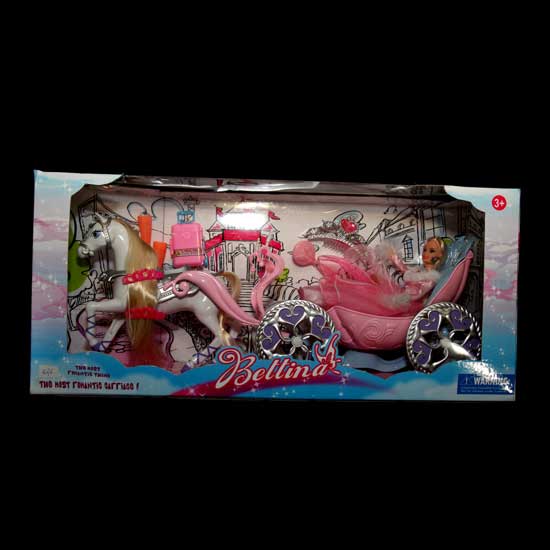 Highlighted here is a doll play set that with a fairy tale theme. A feminine doll, a white horse and a pink horse cart are included in the doll set. This doll play set is a great choice for pleasing your little girls.