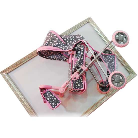 Displayed here is a doll pram designed for kids aged three and up. It is characterized by the allover dot patterns. The authentic details convey a realistic touch.