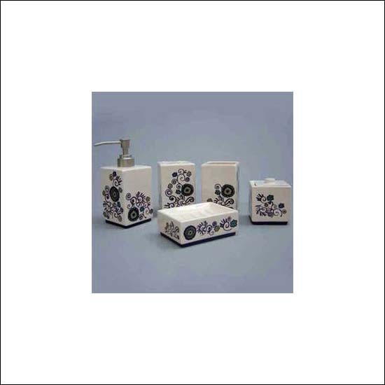 A set includes lotion dispenser,toothbrush holder, tumbler, canister, soap dish