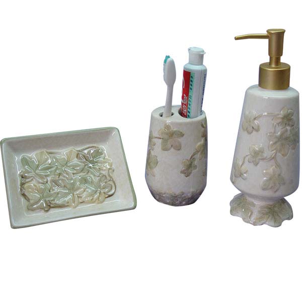 - Set of 3 dolomite bathroom set, include lotion pump, tumbler, brush holder, soap dish.
