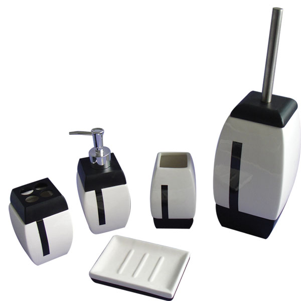 • Set of 5 dolomite bathroom set with black plastic, include lotion pump, tumbler, brush holder, soap dish and toilet brush holder.