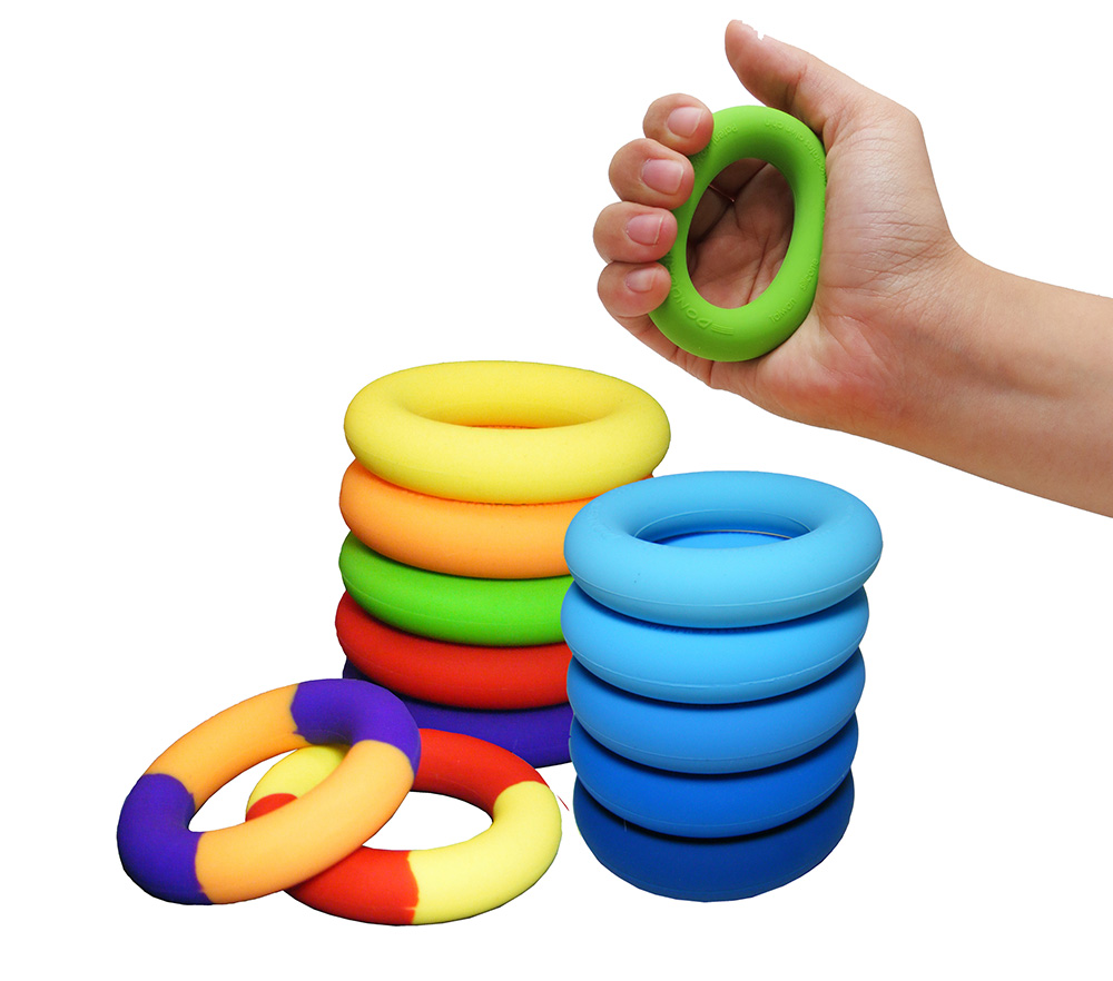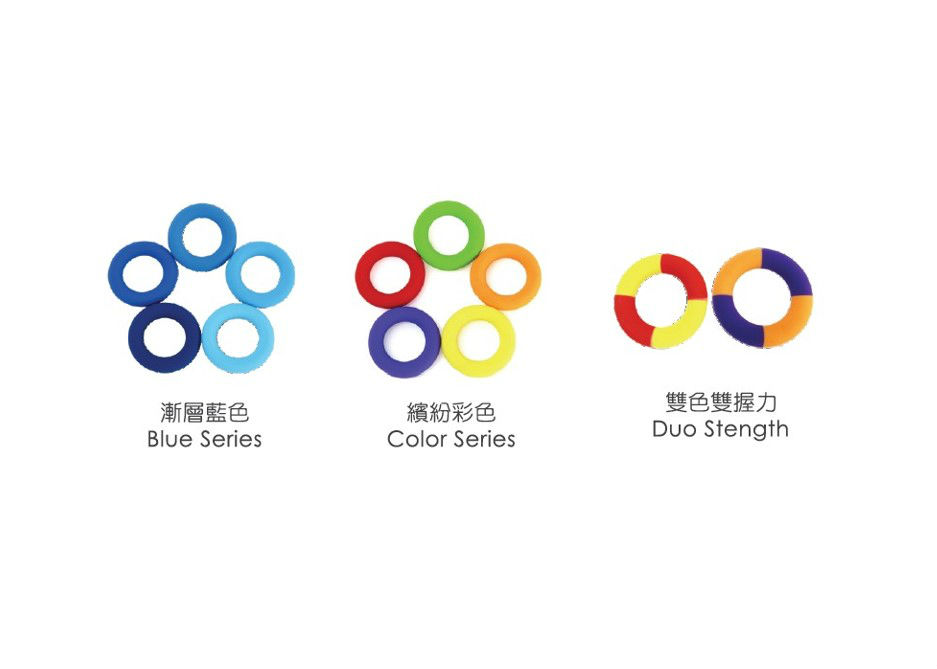 Donugrip is a simple elastic hand-gripper made of food grade silicone. A special formula producing 5 different levels of hardness, using a colour coding scheme from light to dark, indicates the strength and weight from light to heavy. Thus, Donugrip is effective for handgrip strength training, hand and finger muscle enhancement, handgrasp rehabilitation after injury and/or operations, and also for providing stress relief. Being that the Donugrip may likewise serve as a teether and toy for infants, and also as a hand nerve-ending stimulus instrument for the elderly, it boasts a universal design.