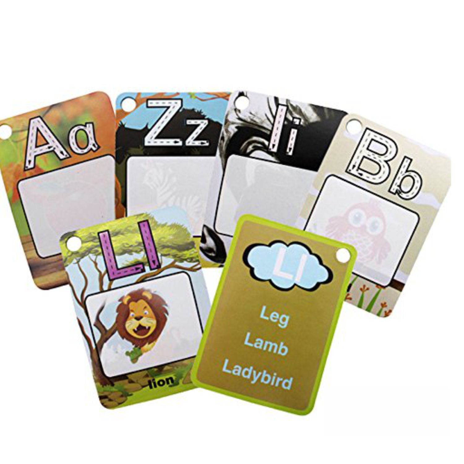 The set includes 26 letters flash cards. There are three basic sight words on the back side. It is a great method to teach visual learners for your child at home. With these cards you can teach a child at the level they are up to.