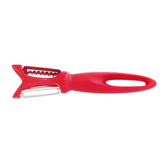 Displayed here is a double-blade peeler in vibrant red. It is characterized by the streamline design. The stainless steel blades are built to last for years.