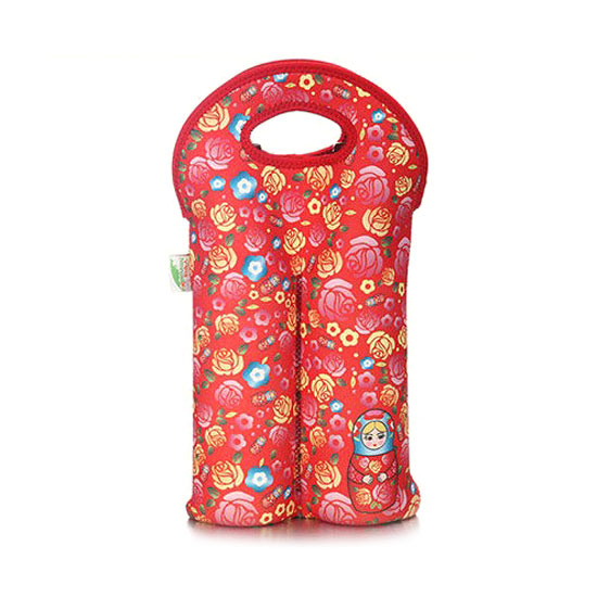 This bottle bag is incredibly eye-catching and colorful with its vibrant floral patterns and matryoshka doll decoration. It comes with sufficient space for housing two bottles. With a convenient handle, you can easily transport your drinks to a party, gathering or picnic.