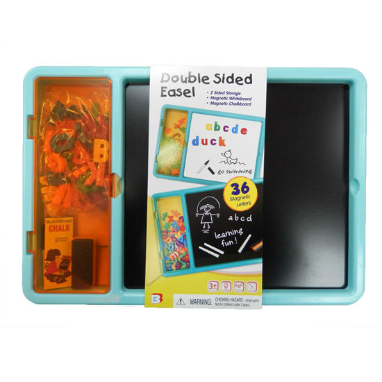 Double sided drawing board (white / chalk), 2 sided storage, 36pcs magnetic letters, 3 chalks, 1 marker, 1 d/s eraser