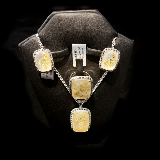 This is a jewelry set that includes a finger ring, a pair of earrings and a necklace with a matching design. Each piece is accented with crystal stones and mother-of-pearl beads. This jewelry set is an ideal addition to complete your fashion collection.