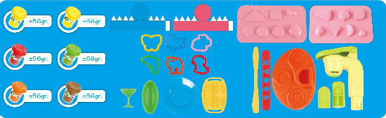 • Include 6 boxes of toy dough, an ice cream squeezer, various shapers and other crafting tools.