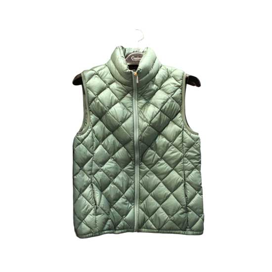 This is a down vest with 90% down. In a fashionable green color, this vest is easy for mix and match. This soft and lightweight down vest is a good choice on chilly days.