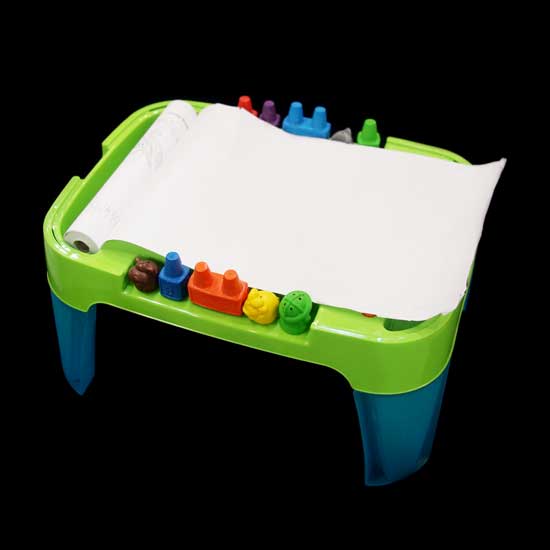 This is a drawing art desk with a durable structure in green and blue. It is designed with a paper roll and colorful crayons in different shapes for added fun. This desk makes an ideal choice to develop your kid's artistic skill under a cultivate practice environment.