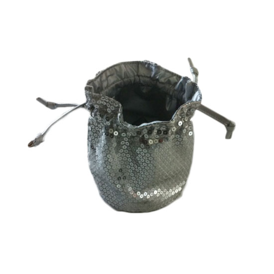 This is a drawstring bag with a dainty and stylish design. It comes in metallic gray with sparkling sequins on the exterior for added charm. This bag is made with excellent workmanship and attention to detail.