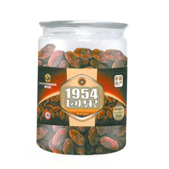 Displayed is dried grape that comes in a clear jar. Processed professionally, this dried grape has a healthy dark red color and a sweet taste. The seed is removed for your better enjoyment.