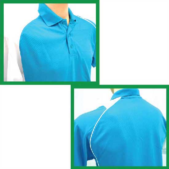 Pictured is a dry-fit polo shirt made with quality jacquard fabric. The bright blue polo shirt is treated with special process to ensure quick drying upon massive sweating. It makes a nice casual-wear item for gentlemen in summer.
