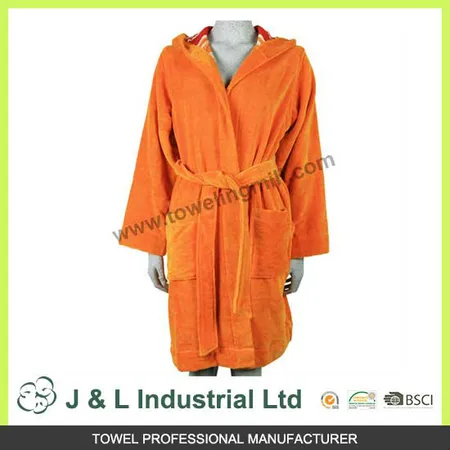 Designed with a refreshing orange look, the pictured cotton bathrobe features double-sided terry finishing for a smooth and soft texture. The long sleeves are loose to offer you comfort, while a standard fabric belt helps you tighten the robe. There is a hood for you to keep your head warm, and its inner side is garnished with multi-colored stripes.