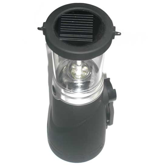 Displayed is a dynamo camping lantern equipped with 4 LEDs. It illuminates for up to 20 minutes after being cranked for one minute. The lantern can also charges mobile phones for an added convenient function.