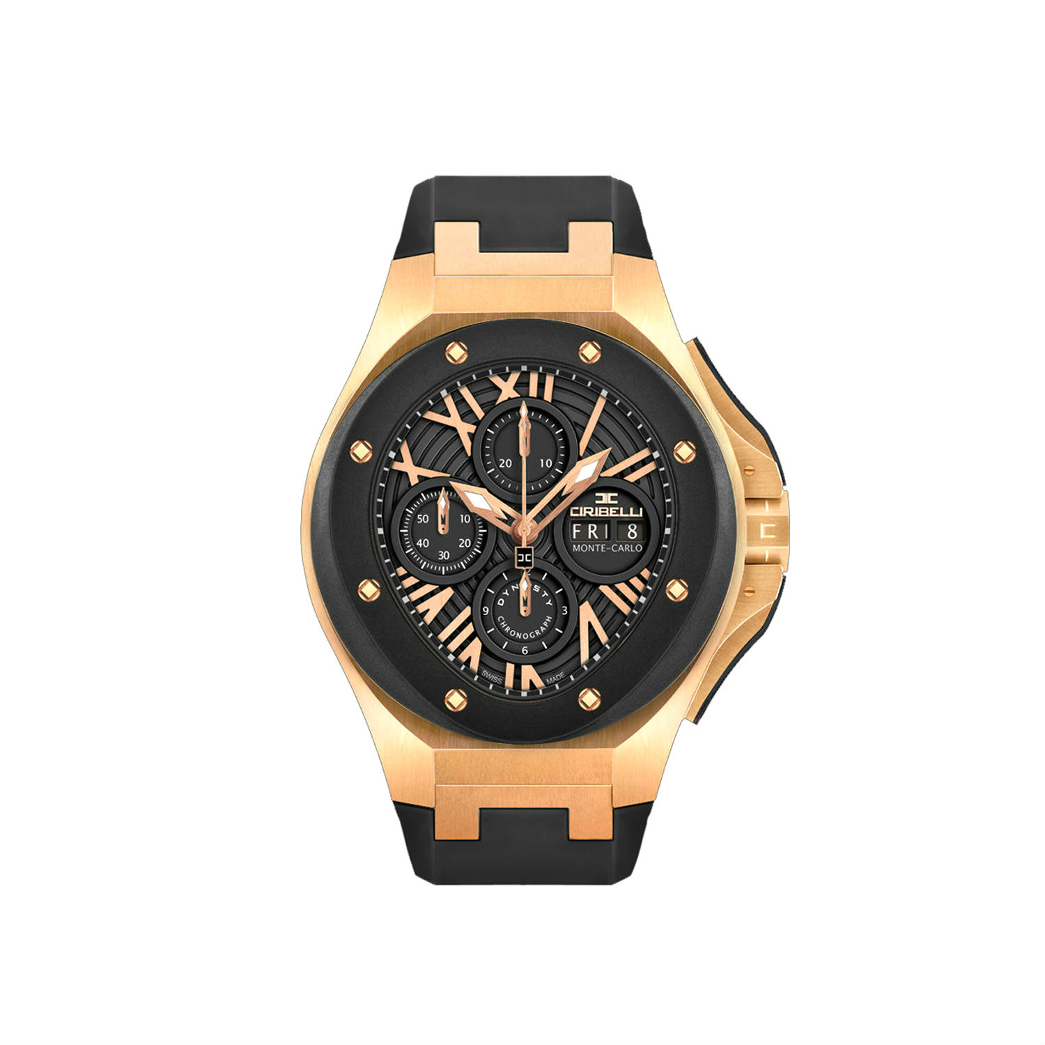Topped with misshapen Roman indexes and assembled with four auxiliary dials, the grooved watch dial featured here offers a complicated appeal to flatter watch connoisseurs. The watch features a calendar complication with the day and date indication at 3 o’clock position. With a case brushed in red gold, this watch makes a classy and catchy accessory for even socialites.