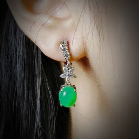 這對翡翠耳環以翠綠色翡翠為主石,搭配精緻的花形鑽石設計,垂墜間散發出優雅與靈動之美,宛如自然與藝術的完美結合。