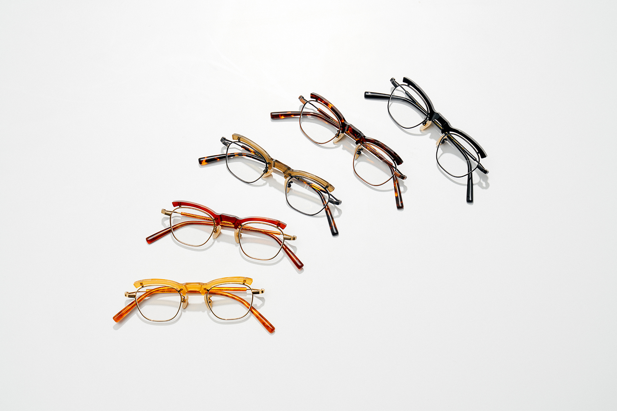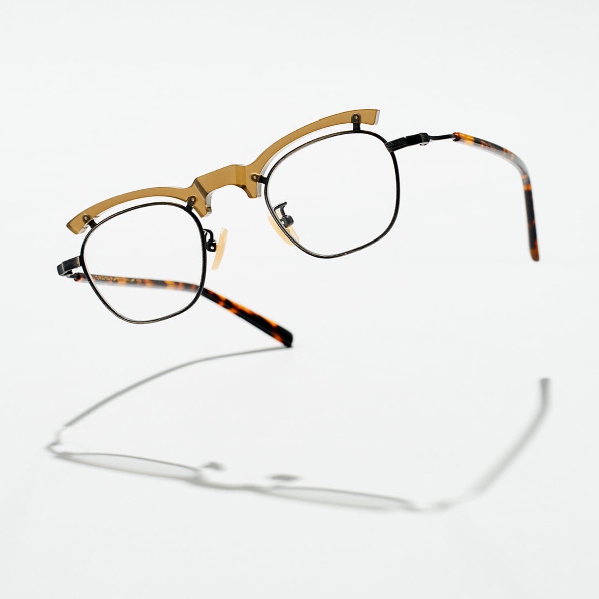 The existing style is restructured using linear layers, and the basic line elements are flattened, chamfered, bent, and arranged in a combination of two different materials to present a sense of contrast, giving new creative possibilities. On the base, titanium metal wires and acetate create a three-dimensional stack, intersecting to create another irregular aesthetic vision, subverting the formal logic of traditional frame making.