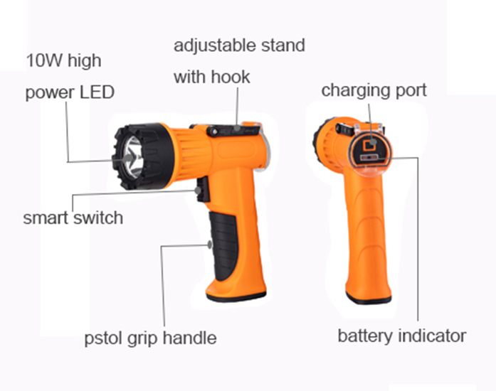 1. Professional rechargeable LED spotlight design, high power 800 lumens, beam distance 600m.
