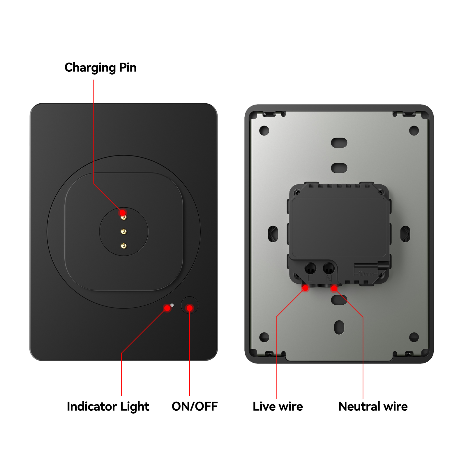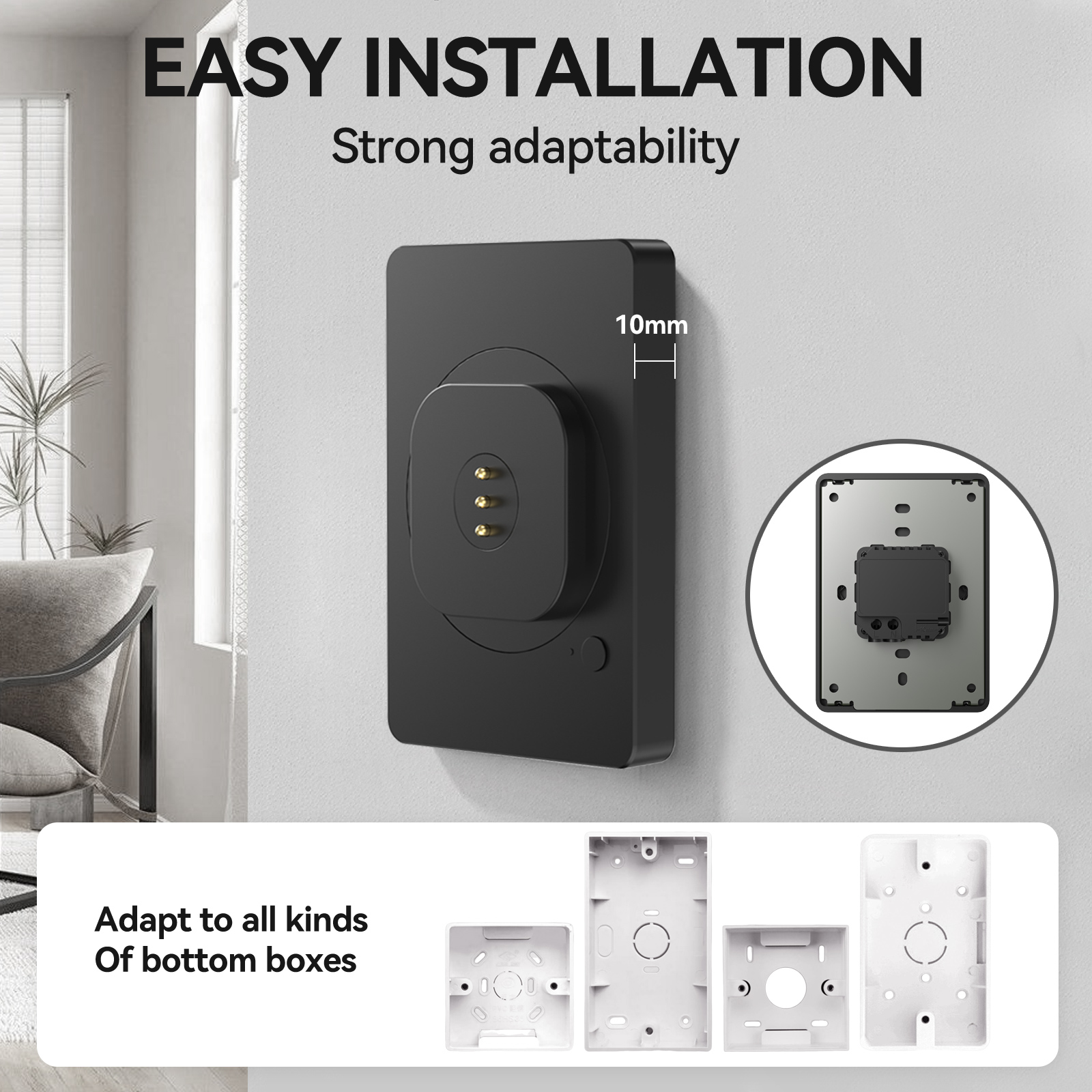 Upgraded magnetic charging port delivers efficient 18W quick charging via built-in circuitry. Compatible with 100–250V AC power, directly wired through your wall’s junction box.