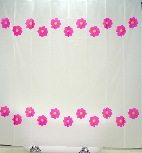Imprinted with rows of pink-colored floral patterns on the top and the bottom, undoubtedly this bath curtain is the first choice for most lasies. The clear white-colored base further highlights the flowers without reservation.